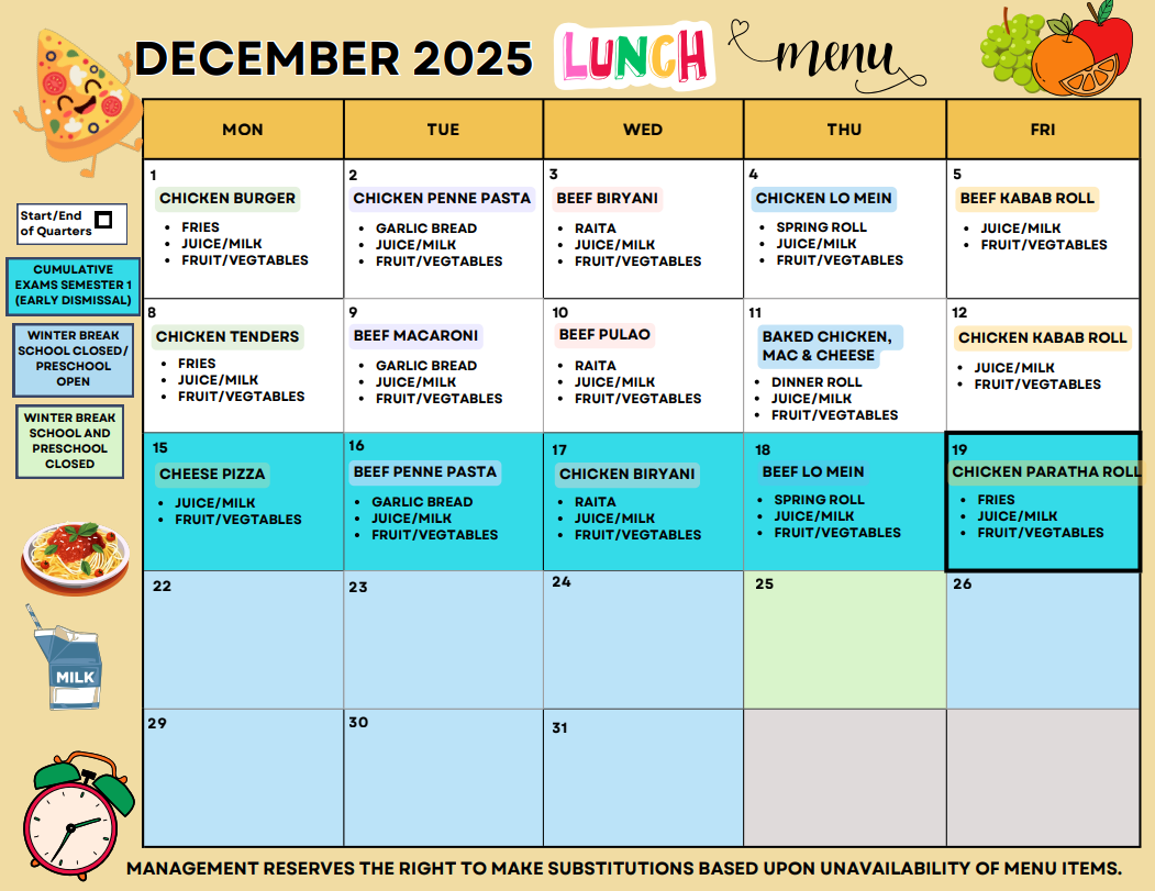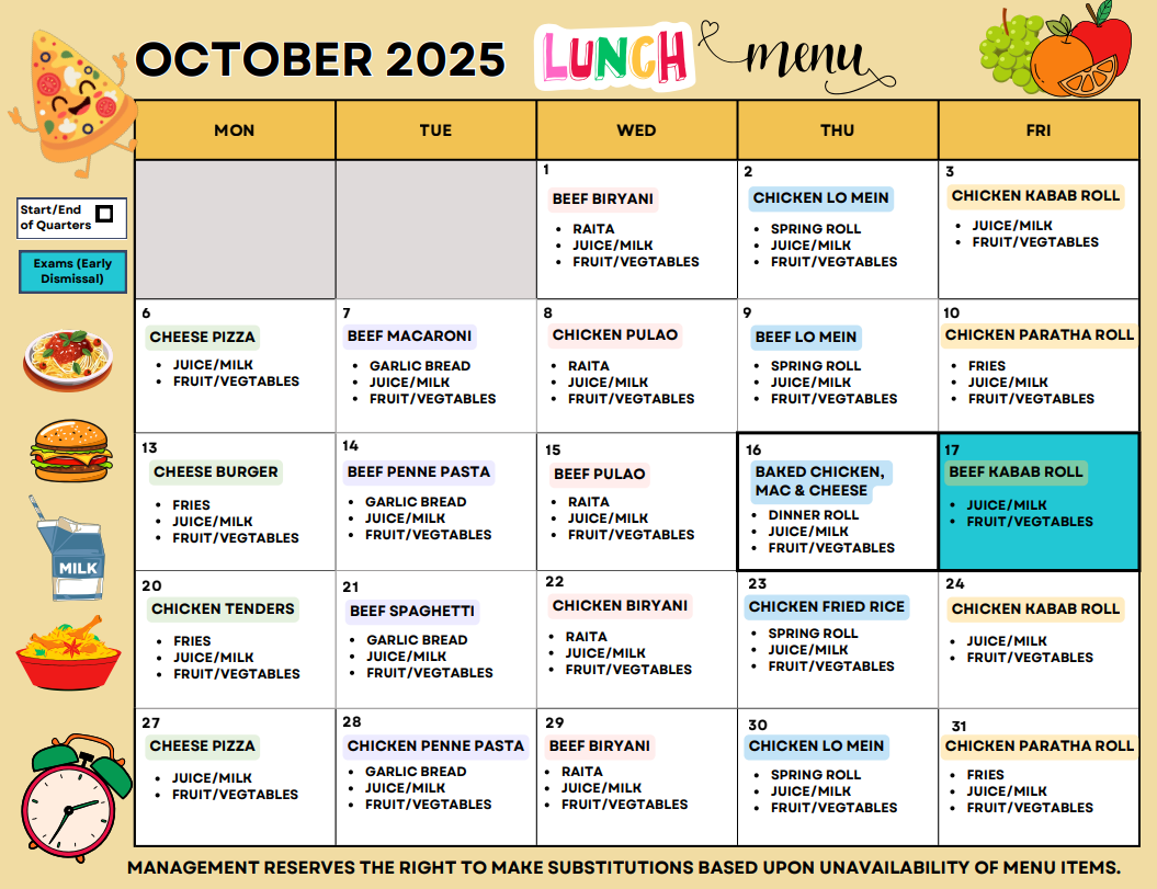 Students are welcome to bring lunch from home. Parents are requested to ensure that all food provided to children is halaal. The presence of non-halaal food undermines the Islamic environment that the school strives to maintain. There are microwaves in the cafeteria where lunch can be warmed up. Students who bring lunch from home may store their lunchboxes in their homeroom (elementary school). Middle and high school students’ lunchboxes must remain in their lockers until lunchtime. Students who bring lunch from home should also bring their own lunch supplies, such as spoons, napkins, straws, condiments, etc.